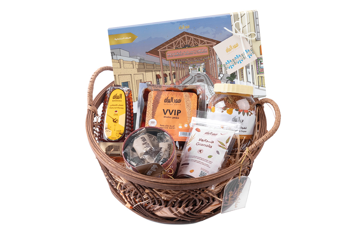 A beautifully curated basket, perfect as a special gift. It includes: /Mubarakiya box containing 725 gm of wrapped stuffed dates /80 gm granola pouch with Medjool dates /400 gm Arabic coffee super /300 gm Natural honey /500 gm pressed Khalas dates (VVIP) /Tin box wrapped Rangina & Khabeesa – 100 gm