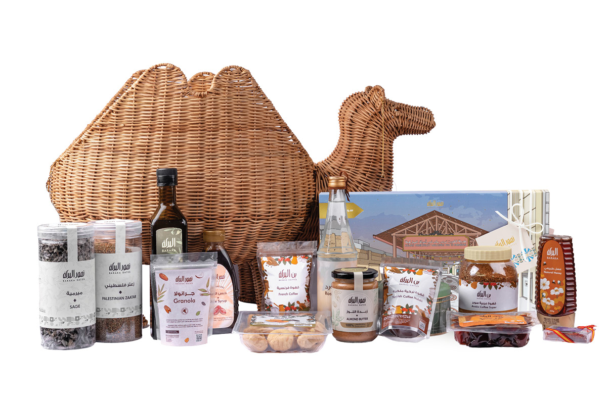80gm pouch of Granola with chopped medjool dates. / Turkish coffee pouch 90gm / French coffee extra 100gm / Super arabic coffee jar 400gm / Rose Water 430ml / Almond Butter 330gm / Natural Honey 300gm /Sage jar 80gm / Tin box – wrapped rangina & khabeesa 260gm / Tin box – Mammoul date 130gm / Tahini 400gm / Palestinian Olive Oil 500ml / Shabbora Pouch / Palestinian Zaatar 300gm / Pressed Khalas VVIP 500gm /Spanish Saffron select 1.5gm /Date syrup 400gm /Packed Fig 350gm