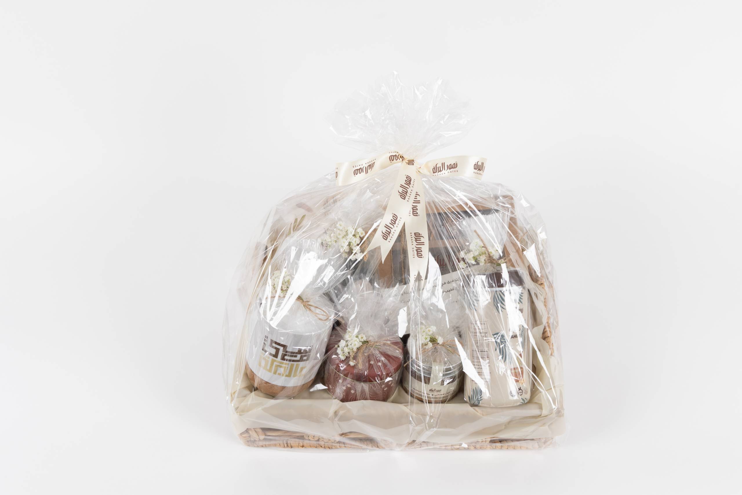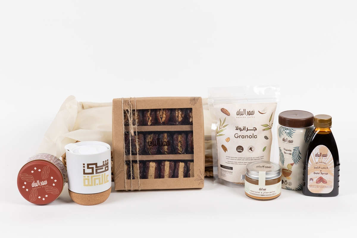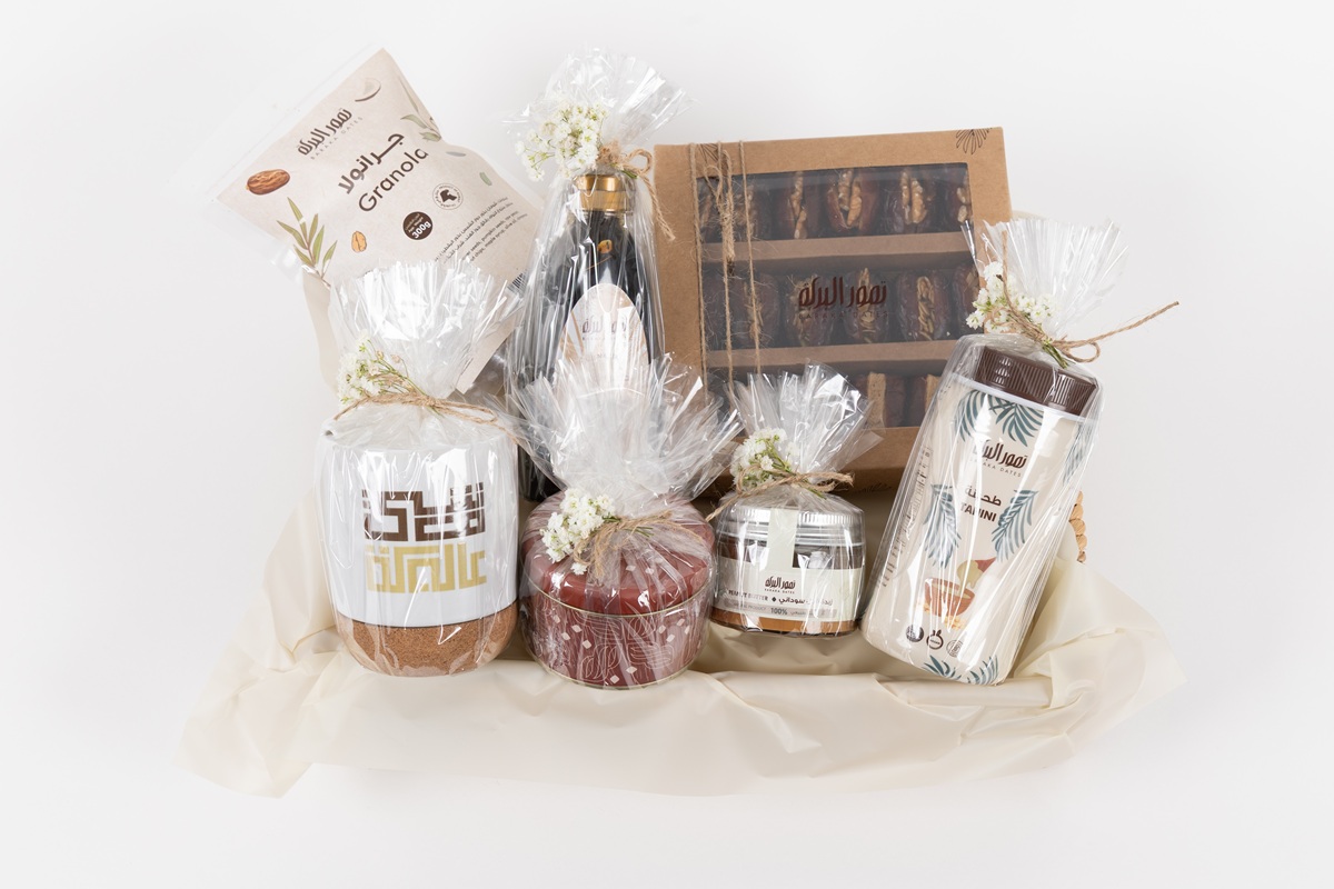 سلة مصممة بعناية لتغذية الأمهات الجدد، تحتوي على وجبات صحية مثل التمر والغرانولا والطحينة، مختارة بعناية لدعم الرضاعة الطبيعية.