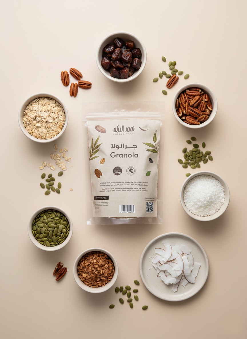 جرانولا لذيذة و صحية محضرة من قطع تمر المجدول وبذور دوار الشمس و اليقطين, و البيكان. محمصة بعناية مع شراب القيقب و القرفة.